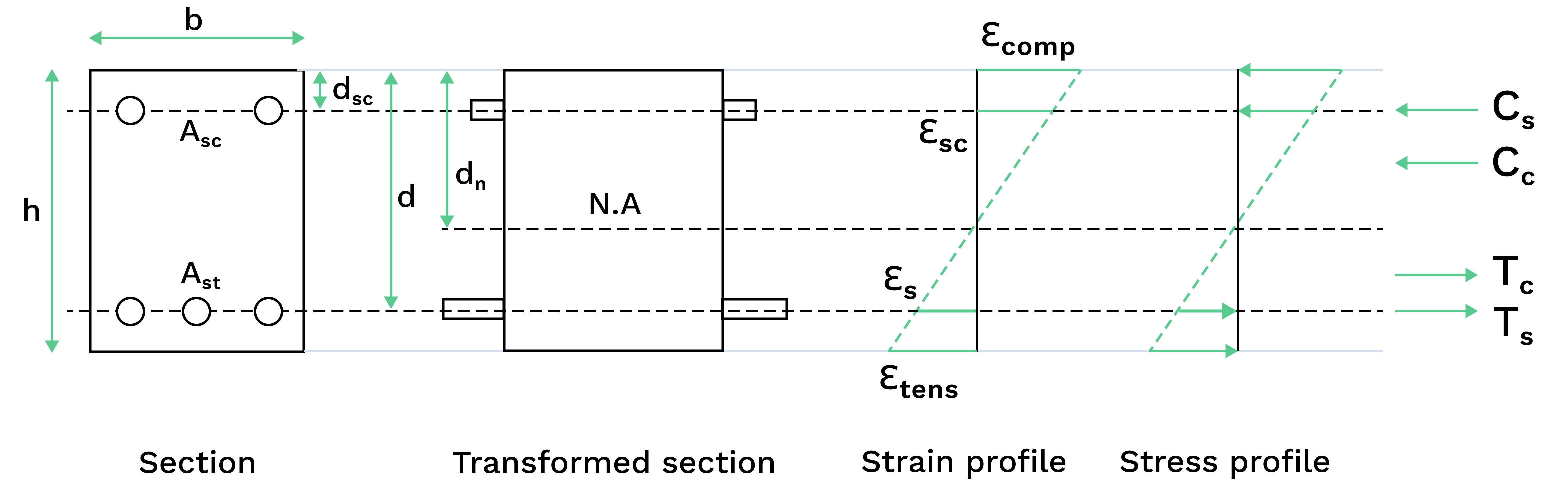 $$\begin{align}&\text{Compression in concrete, }&C_c &= \frac{1}{2} E_c \varepsilon_{comp} d_nb - E_c\varepsilon_{sc}A_{sc} \\[1em]&\text{Compression in steel, } &C_s &= E_s\varepsilon_{sc}A_{sc} \\[1em]&\text{Tension in concrete, }&T_c &= \frac{1}{2}E_c\varepsilon_{tens}(h-d_n)b - E_c\varepsilon_{st}A_{st} \\[1em] &\text{Tension in steel, } &T_s&=E_s\varepsilon_{st}A_st \\[1em] &\therefore &C_c + C_s&=T_c+T_s\end{align}$$