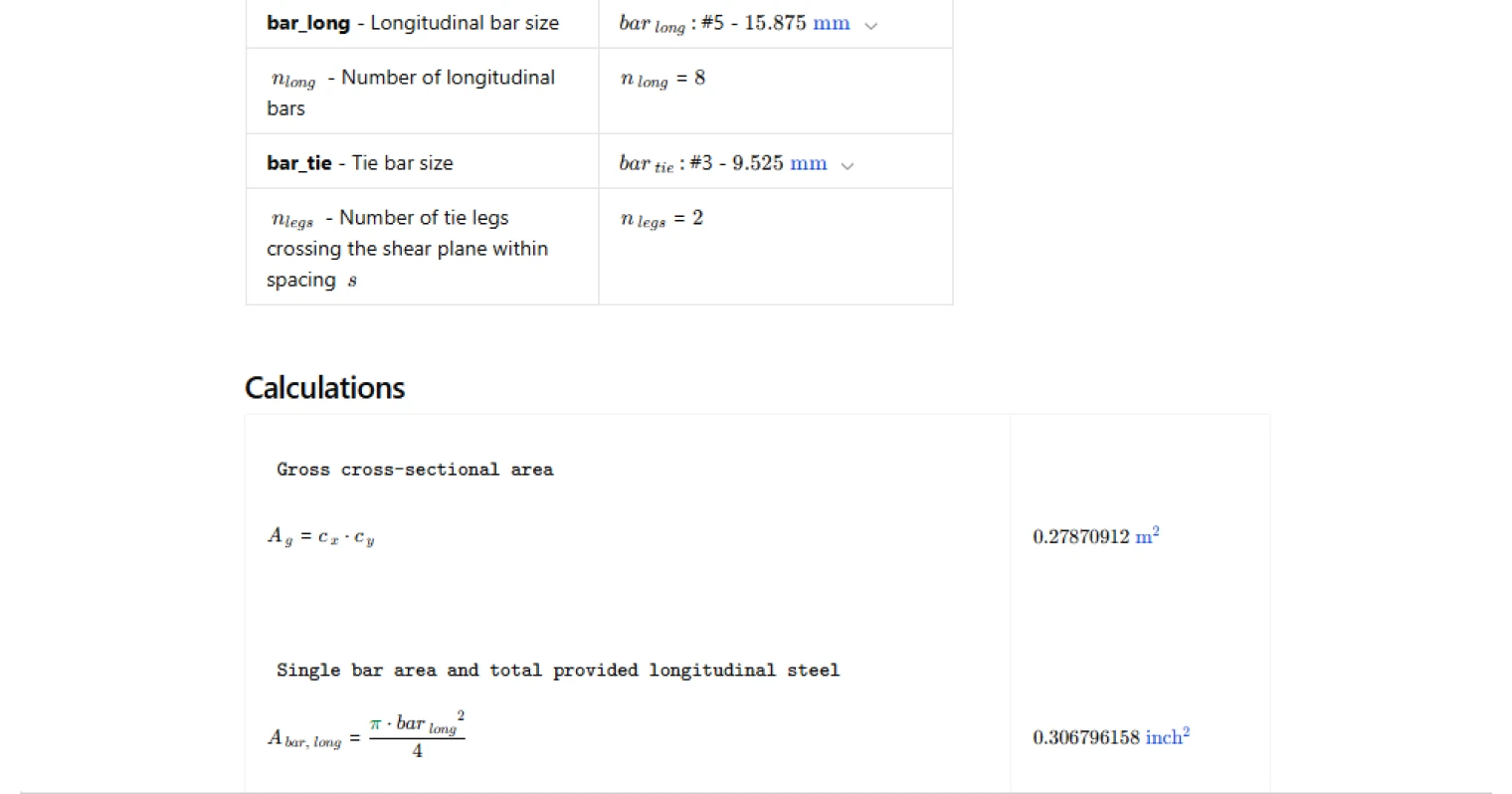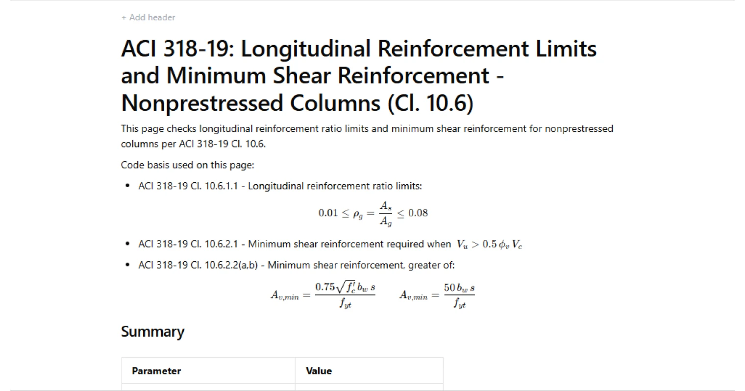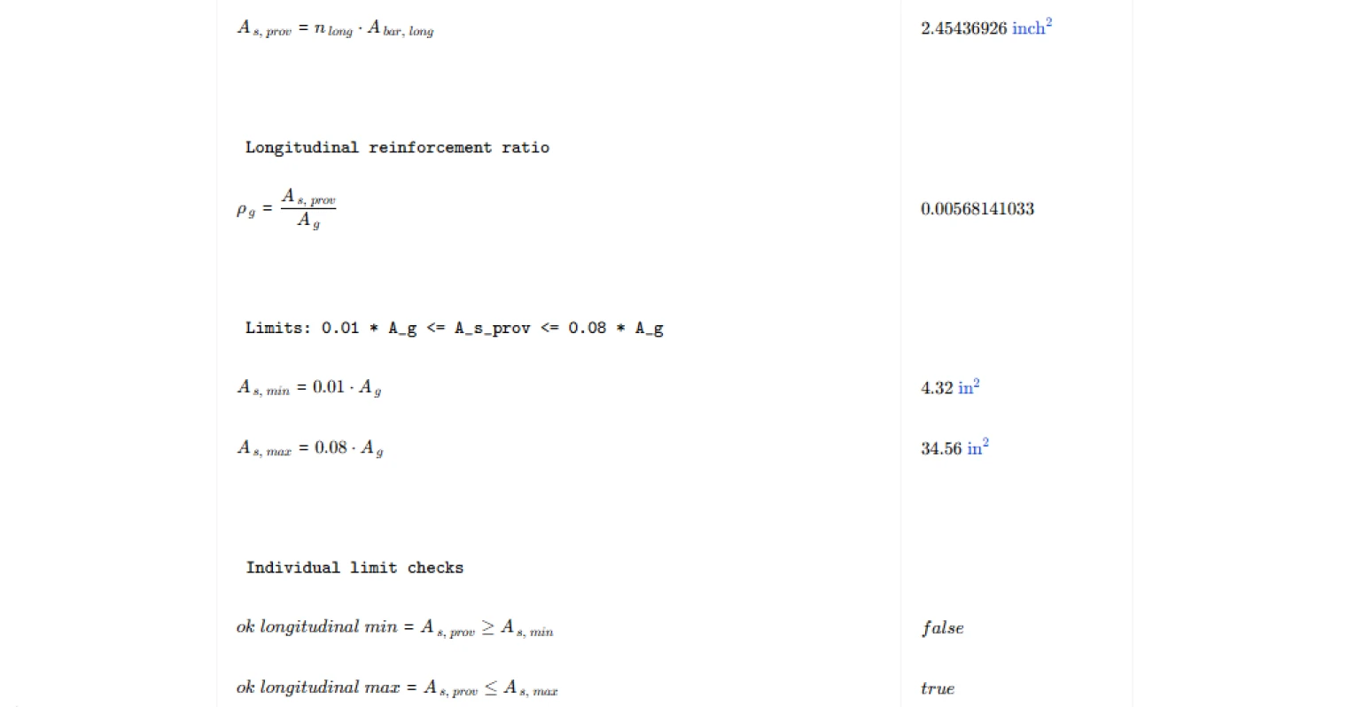 - Structural engineer — verify column reinforcement detailing against ACI 318-19 limits during design or review, with both longitudinal and shear checks resolved in a single calculation.