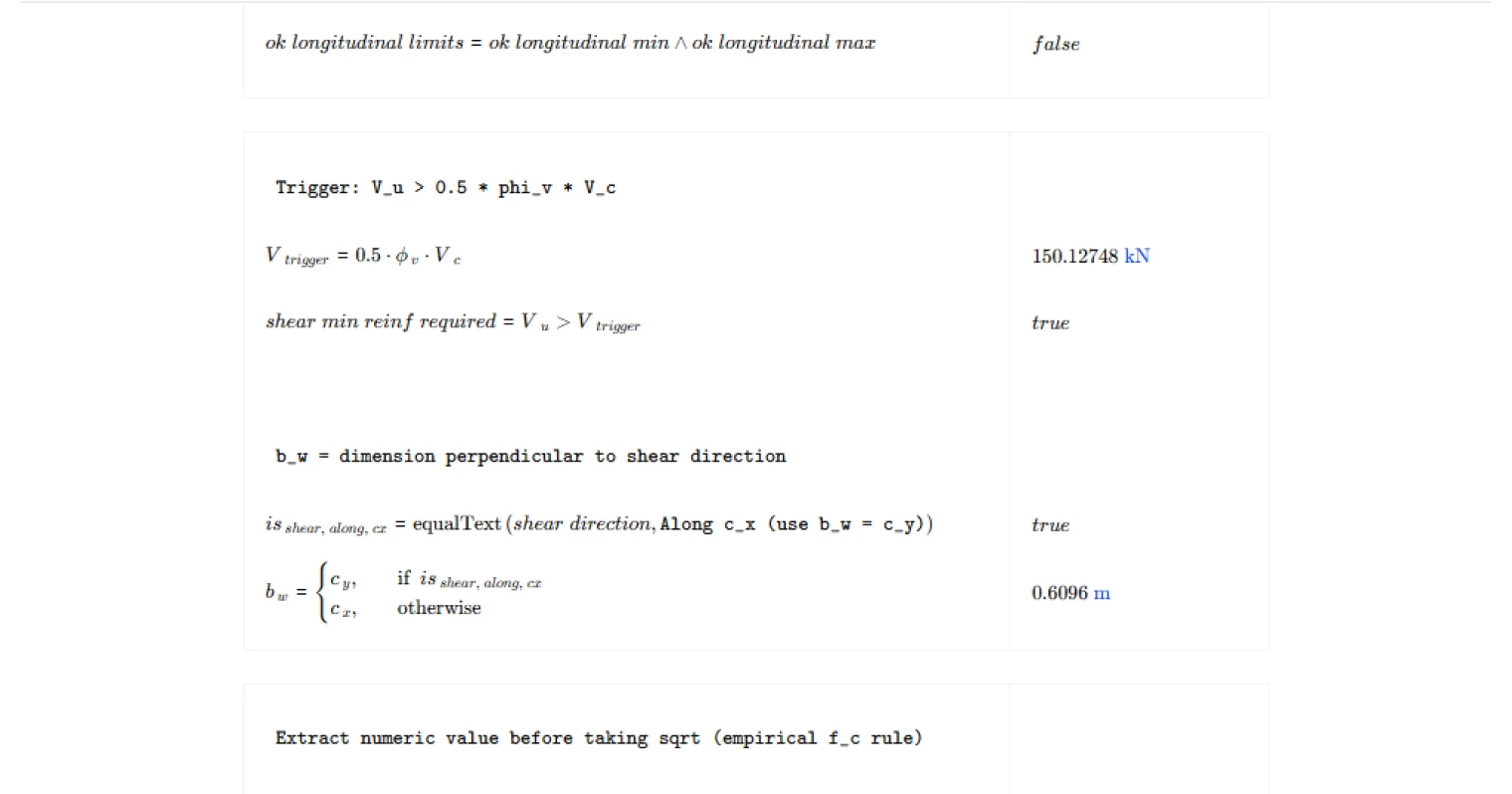 Below this threshold, the concrete alone is considered sufficient to carry the shear demand with adequate reserve. The 0.5 factor provides a buffer before transverse steel becomes mandatory. Once that limit is crossed, ties or stirrups must be provided regardless of how small the excess is. This calculation checks that trigger automatically and reports N/A on the shear check when minimum reinforcement is not required.