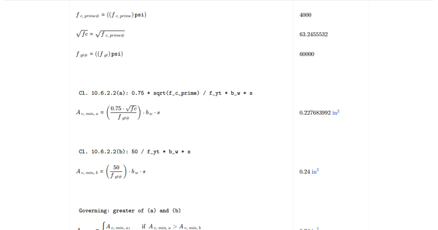 - Misidentifying the web width for shear reinforcement — the web width used in the minimum shear reinforcement equations is the section dimension perpendicular to the direction of shear, not parallel to it. Mixing these up will produce an incorrect minimum area.