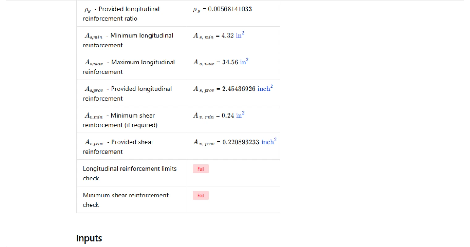 - Using the same yield strength for longitudinal and transverse bars — the minimum shear reinforcement expressions use the yield strength of the transverse reinforcement specifically. If different grades are used for ties and longitudinal bars, ensure the correct value is applied to each check.