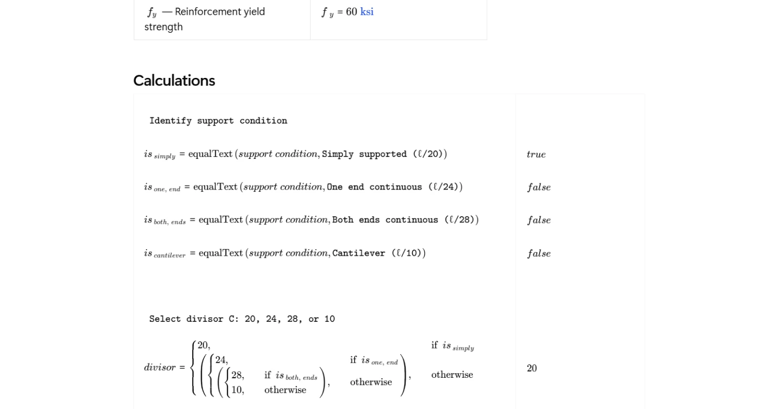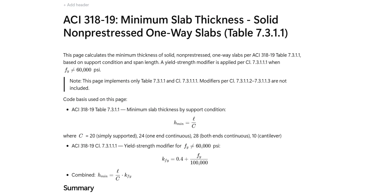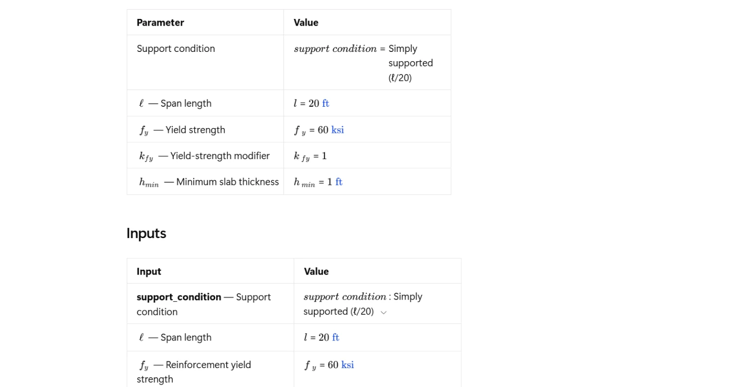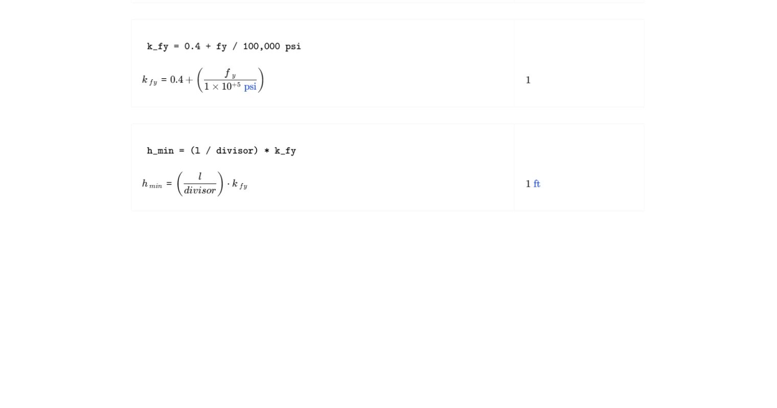 The base minimum thickness is calculated by dividing the span length by a support-condition divisor drawn directly from ACI 318-19 Table 7.3.1.1. When the specified yield strength differs from the reference value of 60,000 psi, a yield-strength modifier is calculated per Cl. 7.3.1.1.1 and applied as a scalar multiplier to the base thickness. The combined result gives the code-compliant minimum slab thickness for the given configuration. Note that the modifiers specified in Cl. 7.3.1.1.2 and 7.3.1.1.3 — for lightweight concrete and for slabs supporting or attached to partitions — are not included in this template.