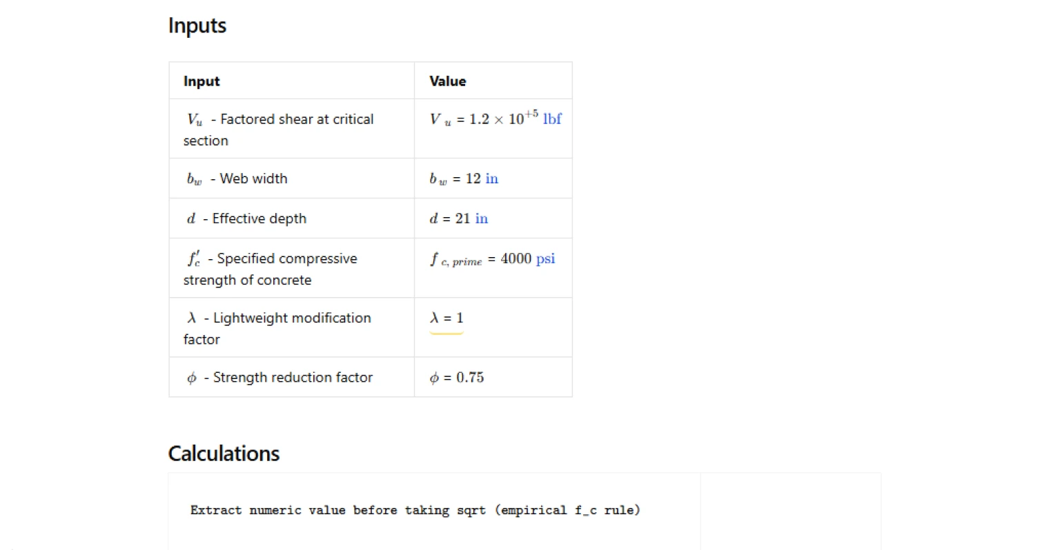 - Using the wrong units for compressive strength — the coefficient of ten in the ACI 318-19 expression is calibrated for psi units. Inputting the compressive strength in ksi or MPa without proper conversion will produce a severely incorrect capacity value.