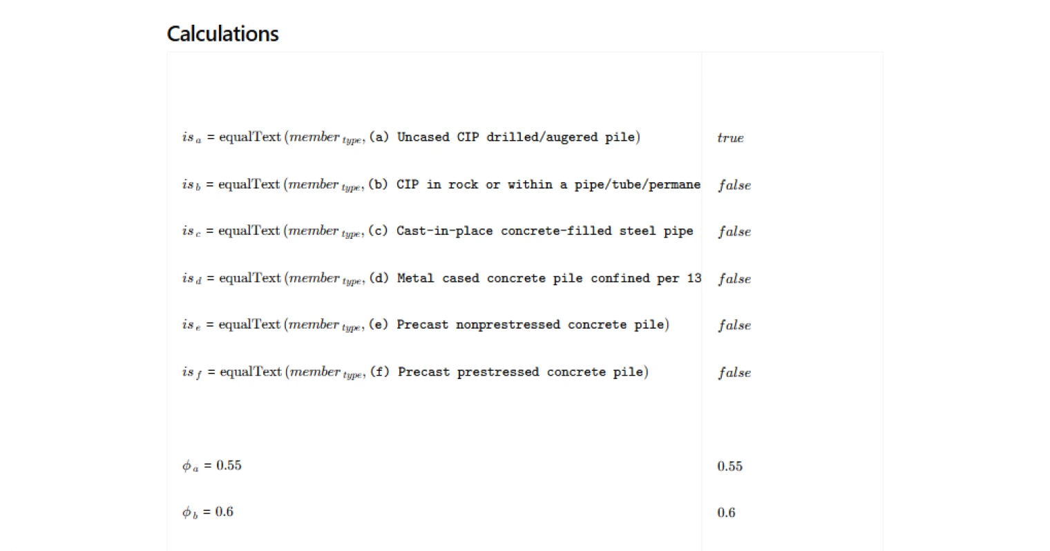 The calculation logic maps each of the six member types in Table 13.4.3.2 to its corresponding φ value using conditional logic, returning the correct factor based on the user's selection. The φ values in Table 13.4.3.2 reflect not just material behaviour but also construction uncertainty inherent to deep foundation installation, and as noted in the ACI commentary, they may represent upper bounds for well-controlled conditions. Lower φ values may be warranted depending on soil variability, construction method, and quality control practices. This calculator is a selector and check tool; it does not compute nominal axial strength.
