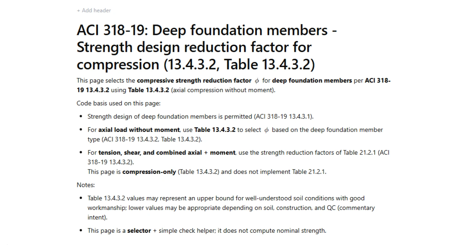 - Foundation designer — use the applicability check to catch load cases that fall outside Table 13.4.3.2 and require a different approach per ACI 318-19.