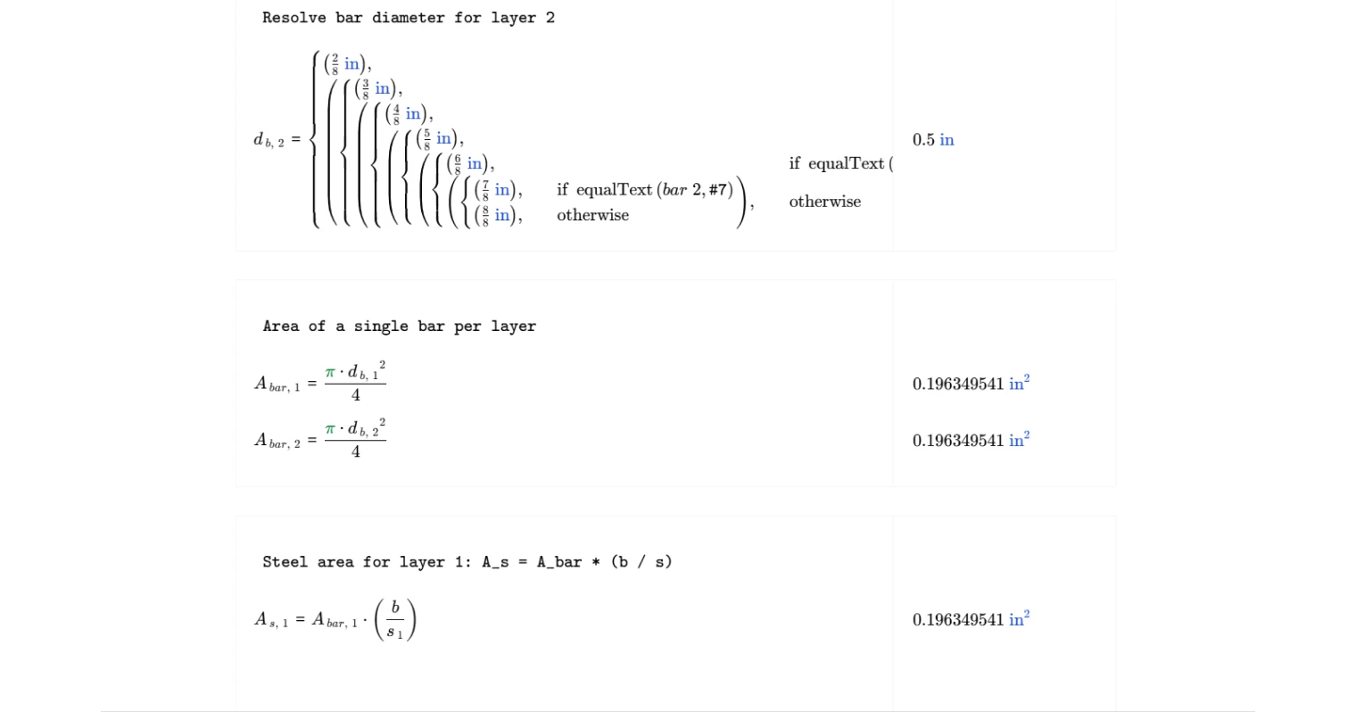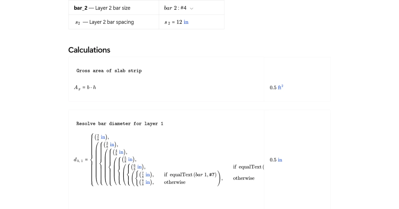 The template covers ASTM standard bar sizes #2 through #8, which covers the practical range used in slab construction. Bars smaller than #2 are non-standard in structural applications, and bars larger than #8 are rarely used in slabs due to development length and flexural depth constraints. Bar diameters are resolved internally from the selected designation, so no manual diameter entry is needed.