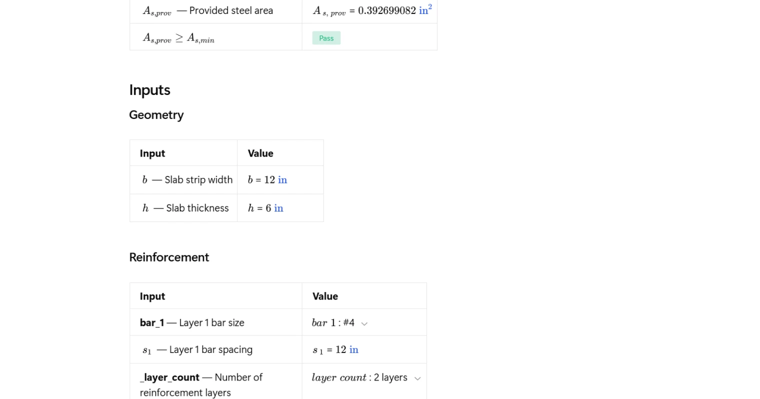 - EOR / plan checker — quickly confirm code compliance for one-way slab sections with one or two reinforcement layers without manually working through bar area tables and gross section calculations.