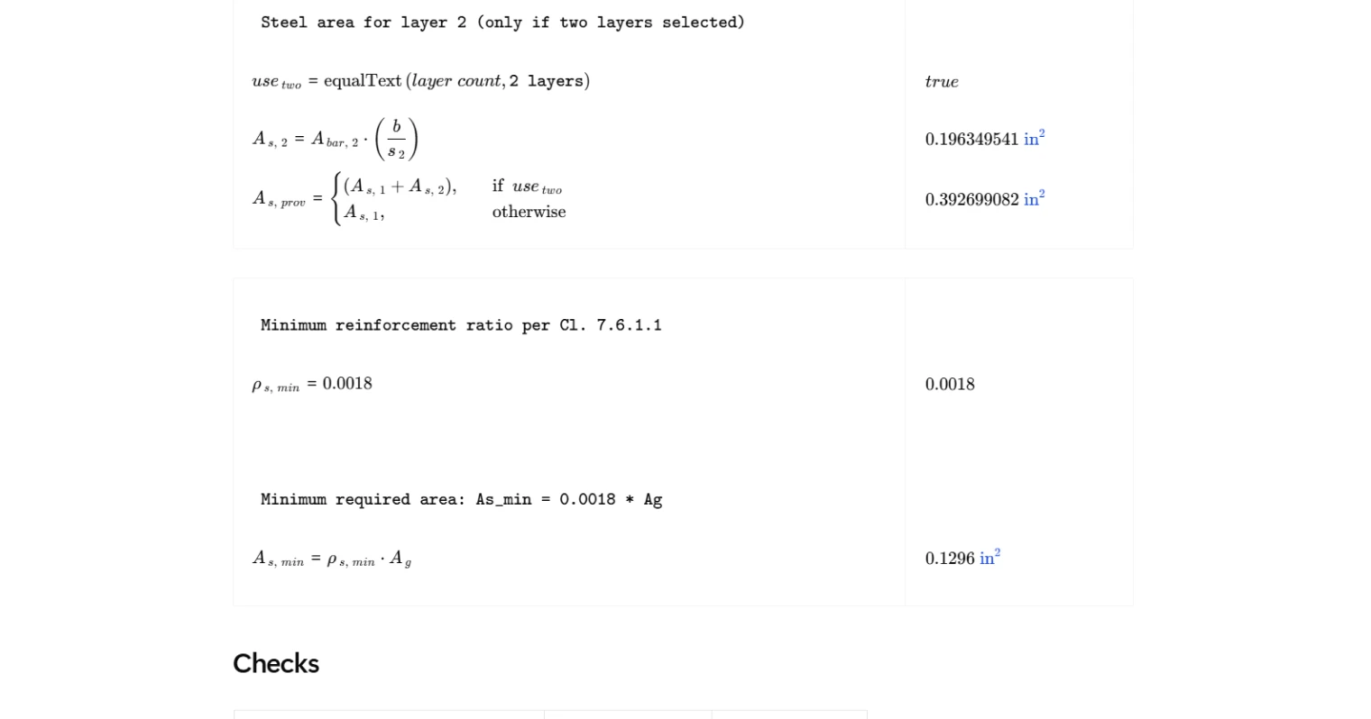 From the geometry inputs, the gross concrete area of the slab strip is computed as the product of the strip width and slab thickness. Each bar's cross-sectional area is derived from its resolved diameter using the standard circular area formula. The provided steel area per layer is then calculated by multiplying the individual bar area by the number of bars fitting within the strip width at the given spacing. Where two layers are selected, the total provided steel area is the sum of both layers. The minimum required steel area is calculated by applying the ACI 318-19 Cl. 7.6.1.1 minimum reinforcement ratio of 0.0018 directly to the gross concrete area.
