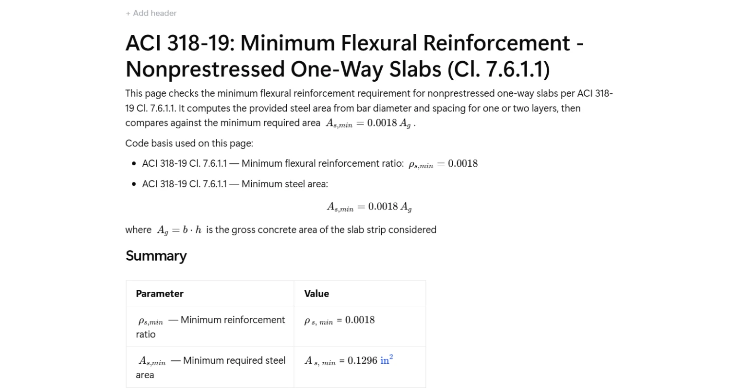Check ACI 318-19 Cl. 7.6.1.1 minimum flexural reinforcement for one-way slabs instantly. Computes As,min = 0.0018Ag and checks provided steel. Try it free.