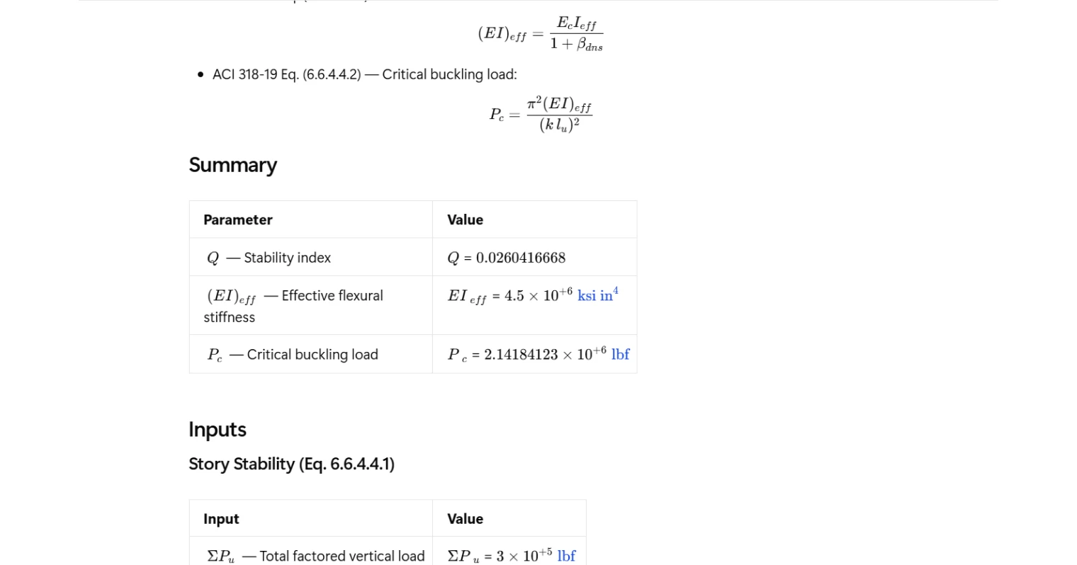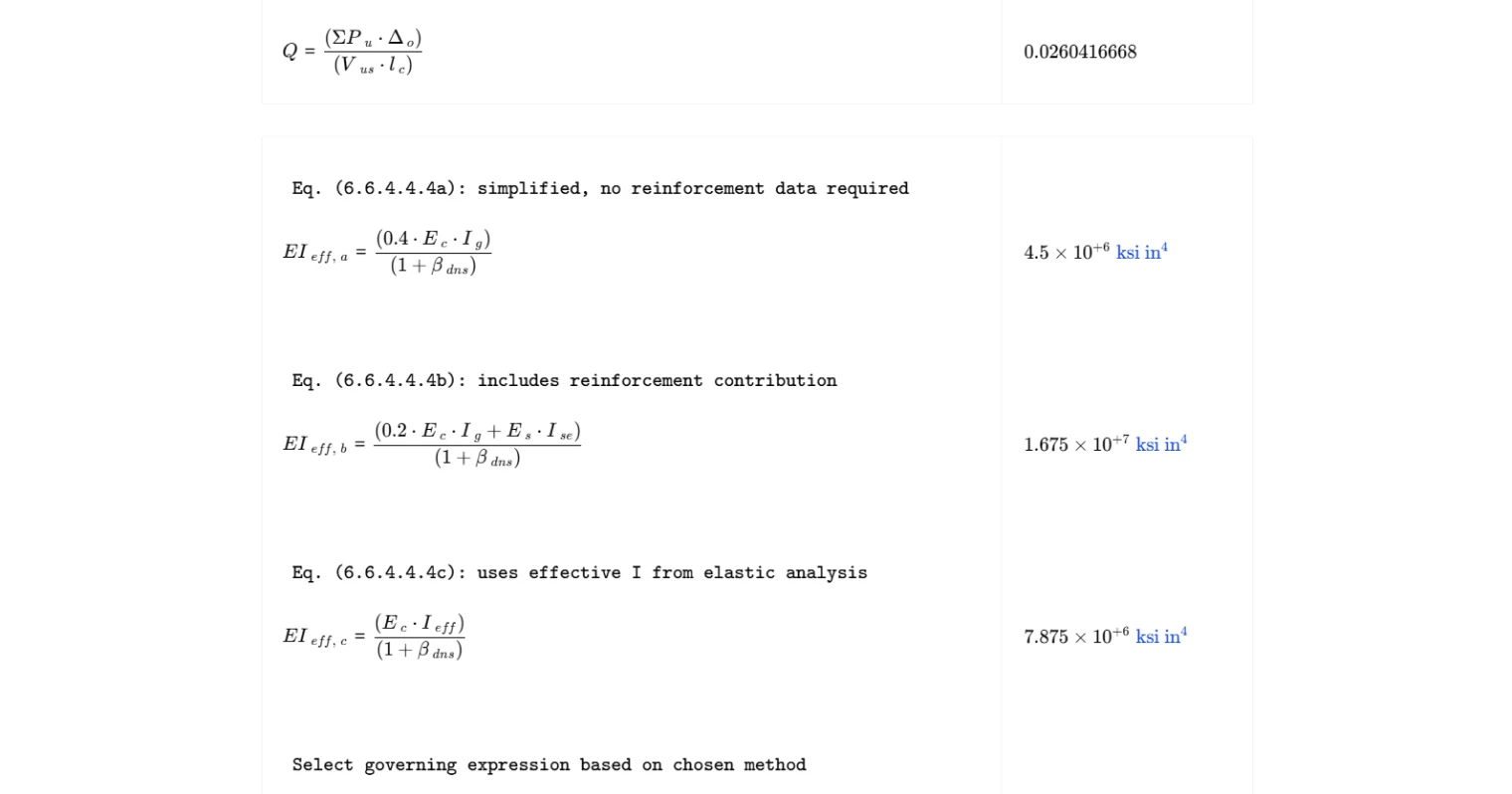 ACI 318-19 Cl. 6.6.4.4: instantly calculate stability index Q, effective stiffness (EI)eff, and critical buckling load Pc. Try it free on CalcTree.