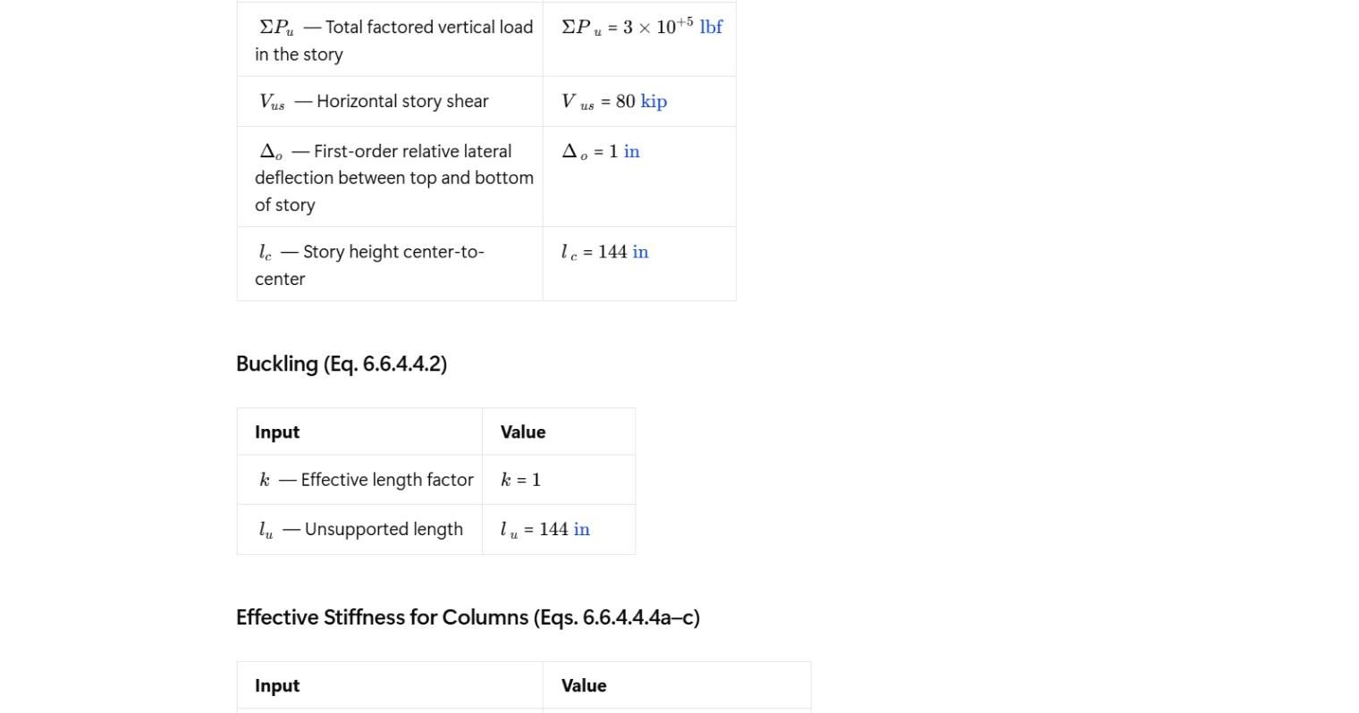 - Using inconsistent load combinations — the stability index should be calculated using the governing factored load combination for both axial load and lateral effects.