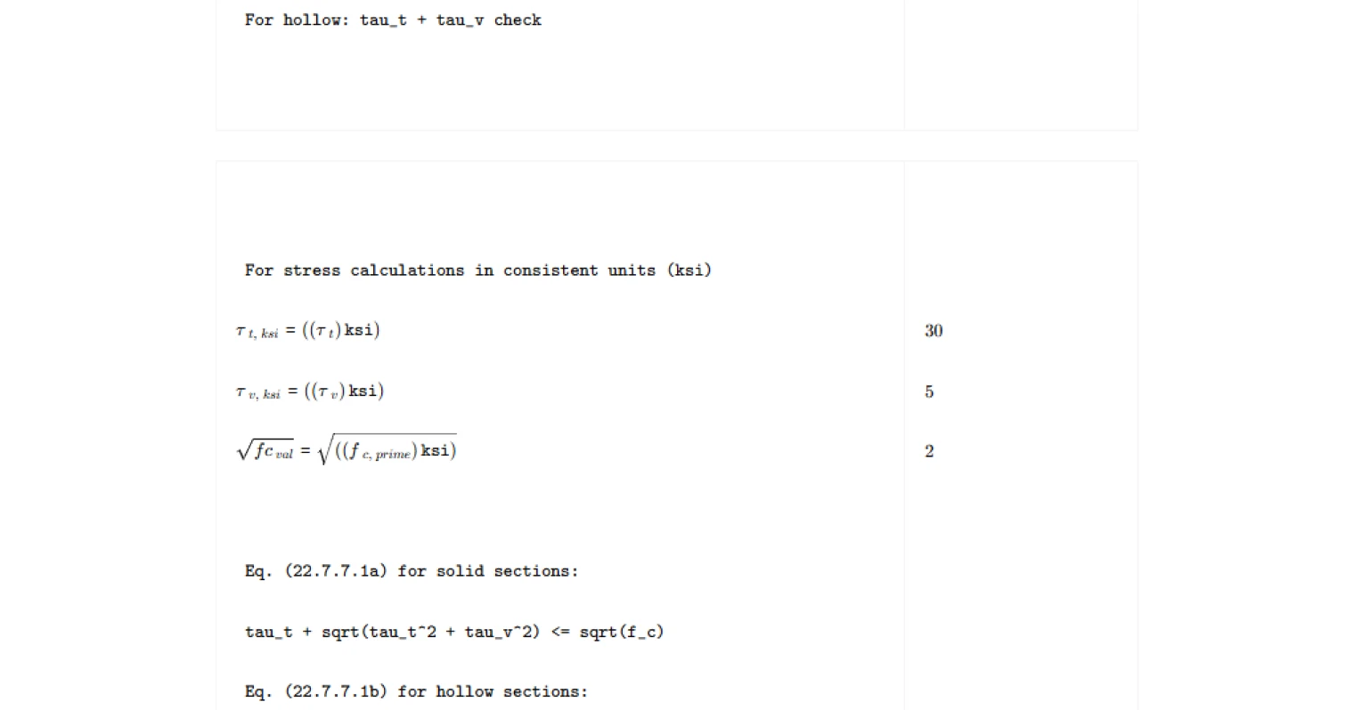 Check ACI 318-19 Section 22.7.7 torsional stress limits for solid and hollow sections instantly. Verify combined shear-torsion compliance — try it free.