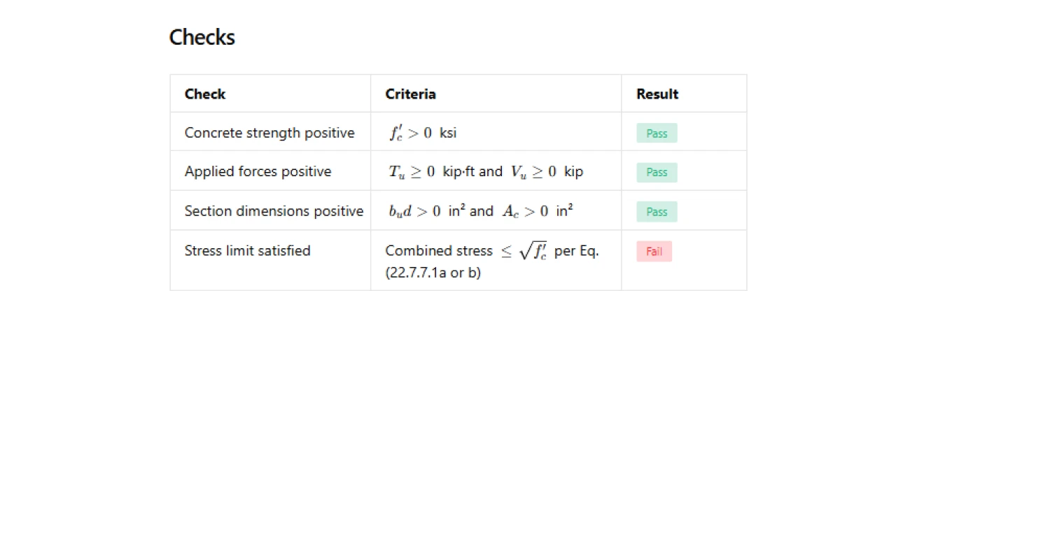 The calculator outputs the torsional stress component, shear stress component, combined stress demand, and the applicable stress limit, all in consistent pressure units. The compliance check confirms whether the combined stress satisfies the Section 22.7.7.1 limit. A set of input validation checks runs alongside the main result, confirming that concrete strength is positive, applied forces are non-negative, and section dimensions are valid before the stress check is evaluated. The summary table collects all key results in one place for quick review and documentation.