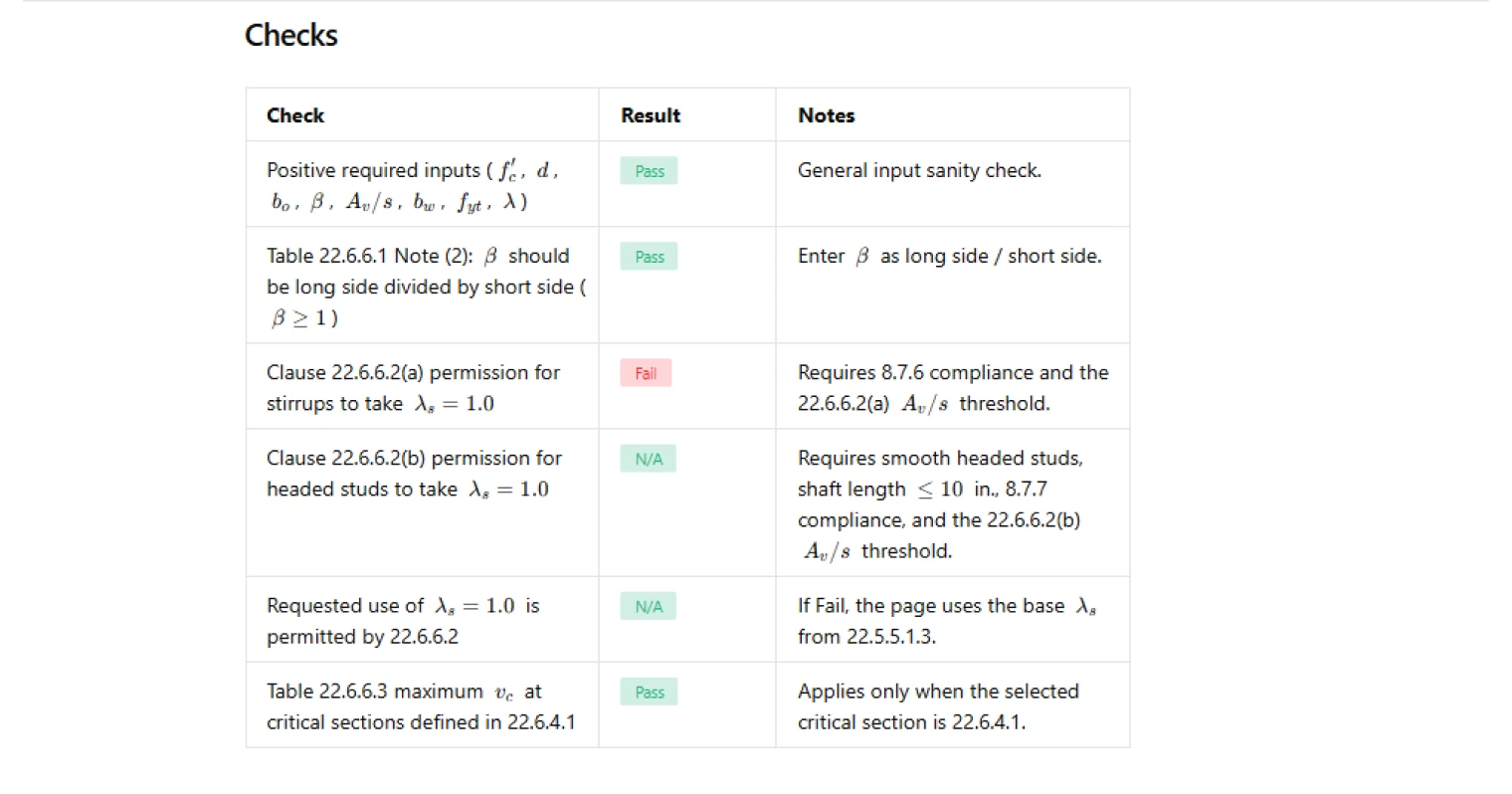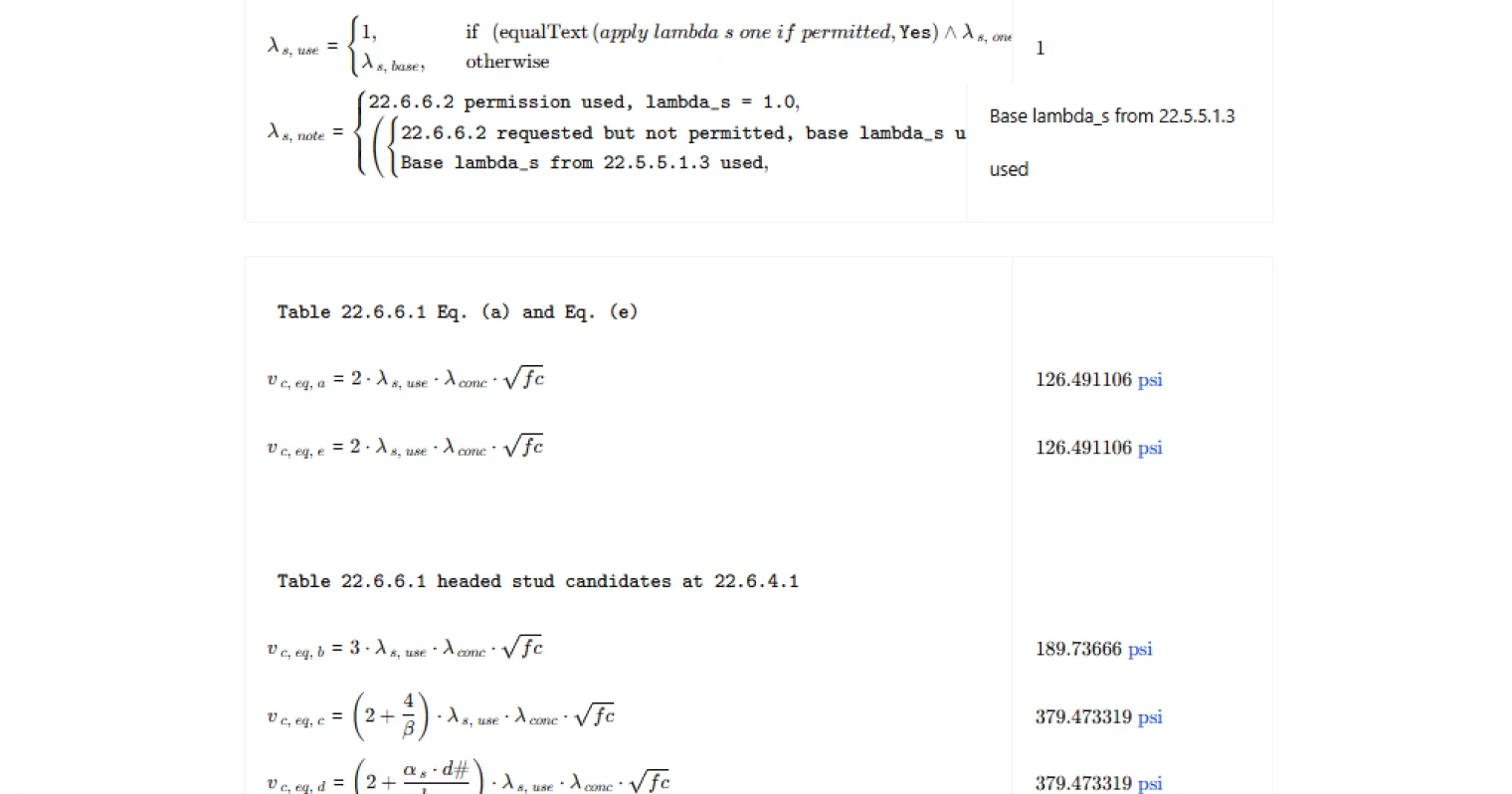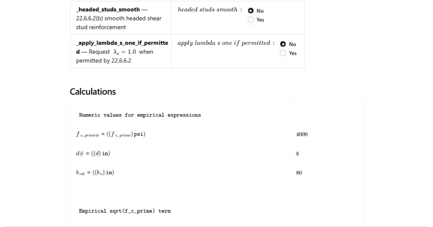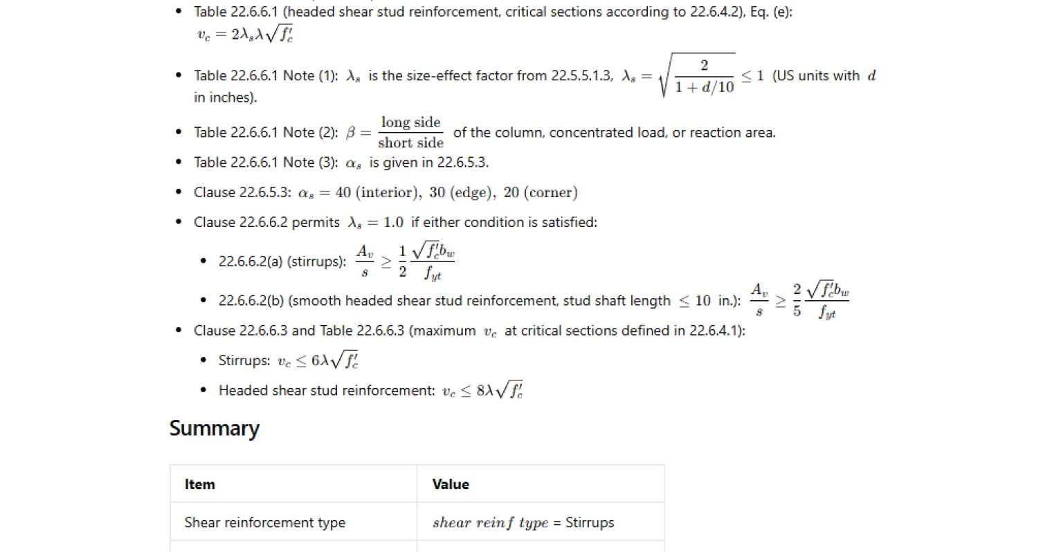 - For headed shear stud reinforcement, it distinguishes between critical sections per 22.6.4.1 versus 22.6.4.2. For the 22.6.4.1 case, it computes the candidate expressions and takes the least-of result, and reports which candidate governed. For the 22.6.4.2 case, it uses the corresponding single expression.