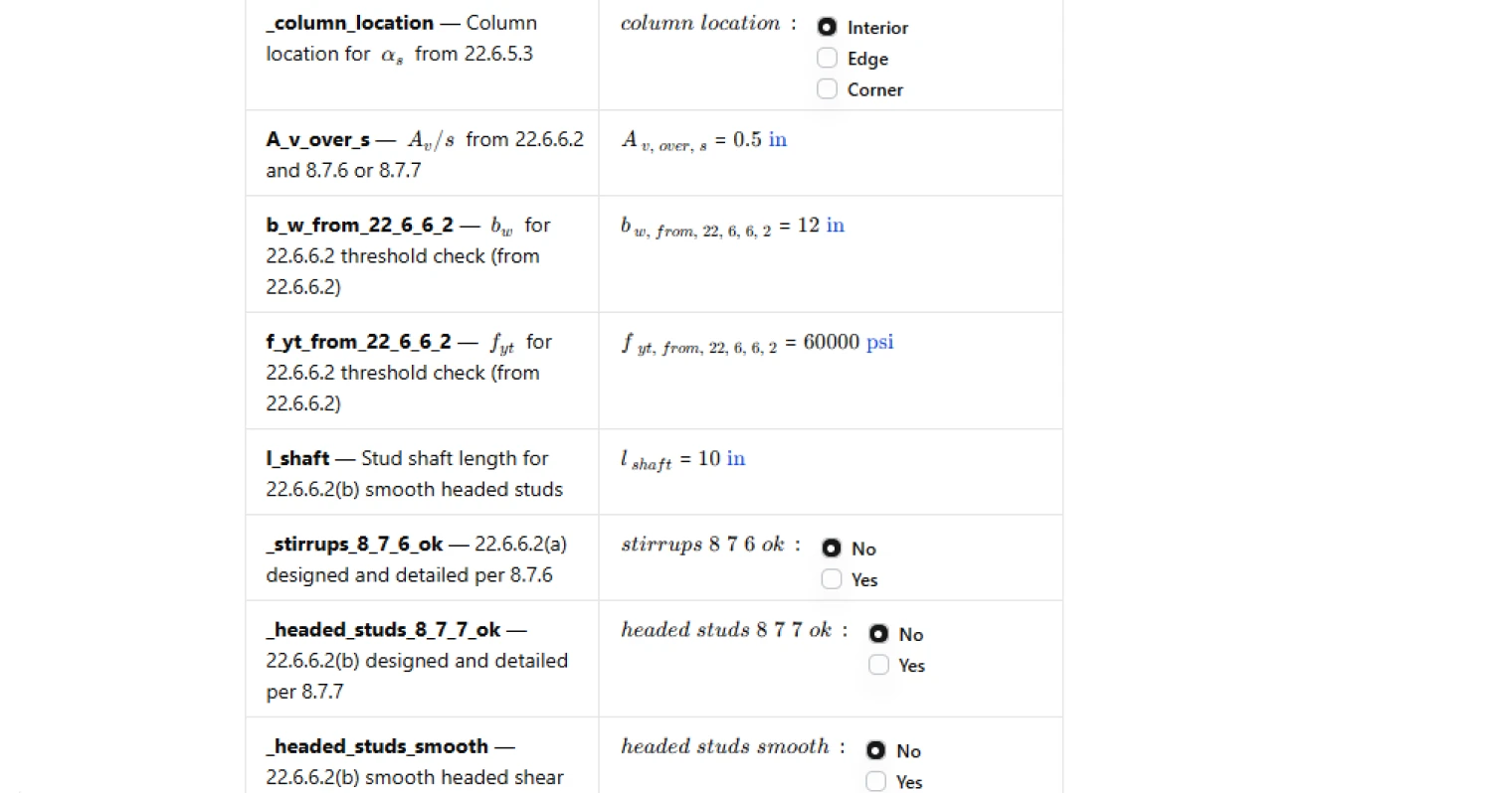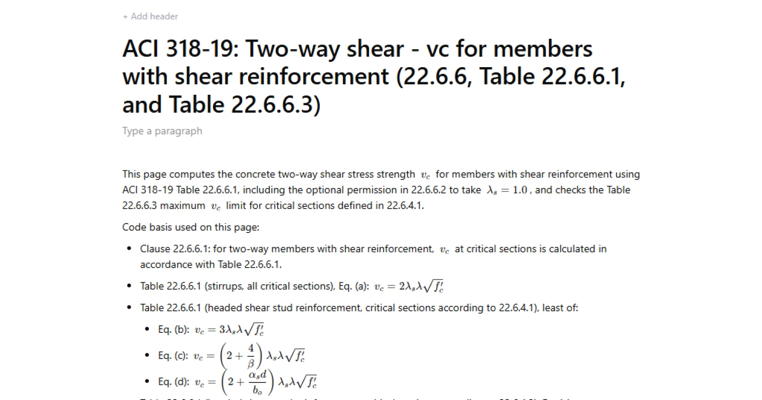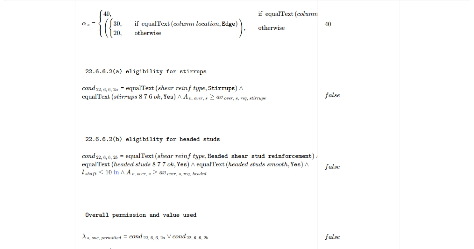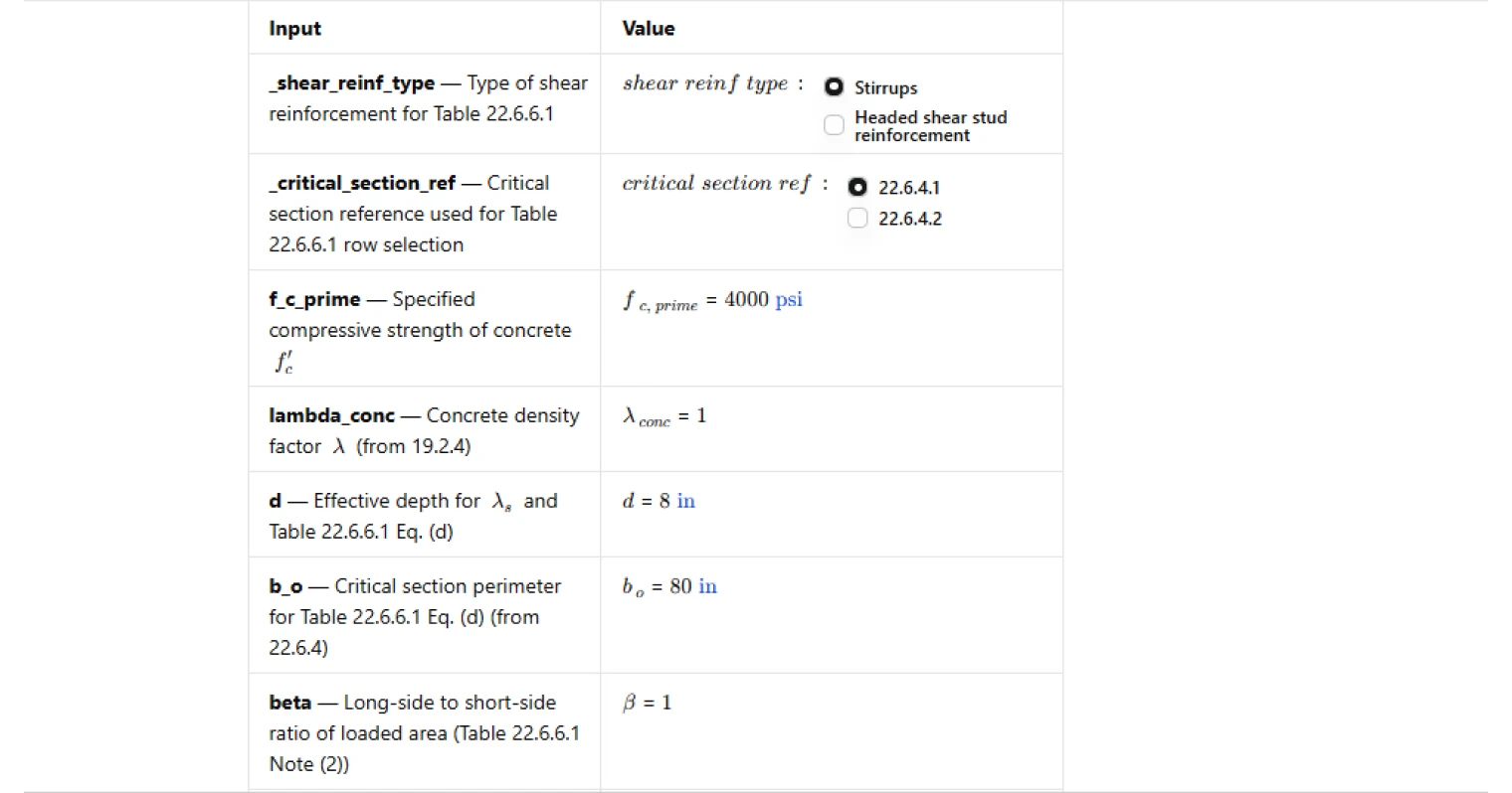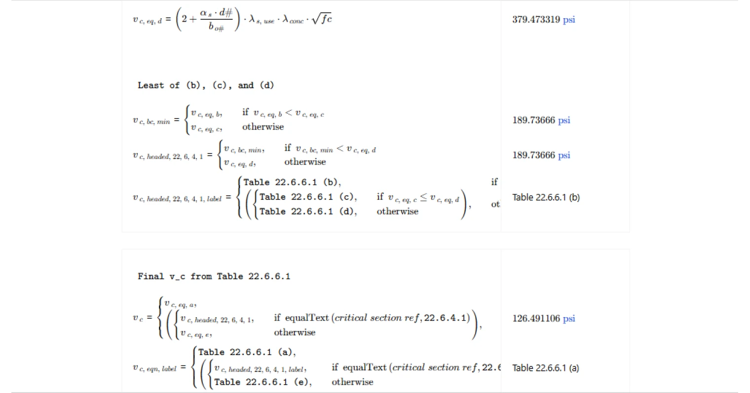- For headed shear stud reinforcement, it distinguishes between critical sections per 22.6.4.1 versus 22.6.4.2. For the 22.6.4.1 case, it computes the candidate expressions and takes the least-of result, and reports which candidate governed. For the 22.6.4.2 case, it uses the corresponding single expression.