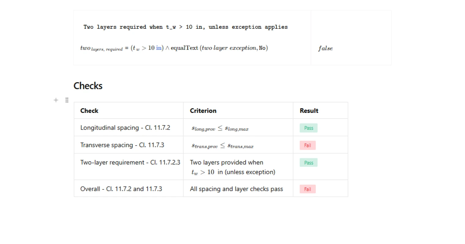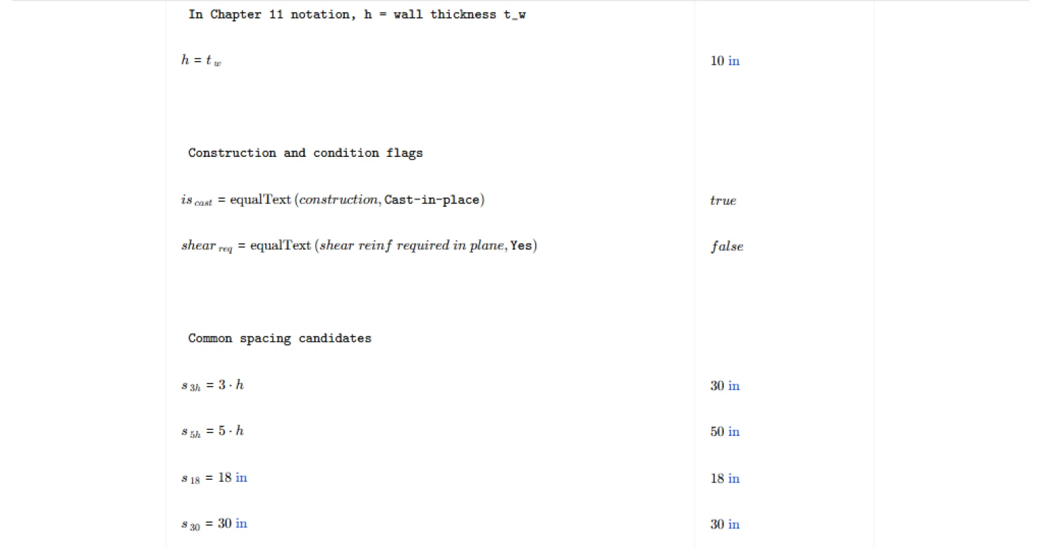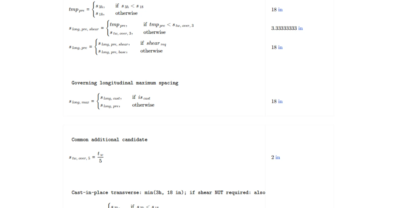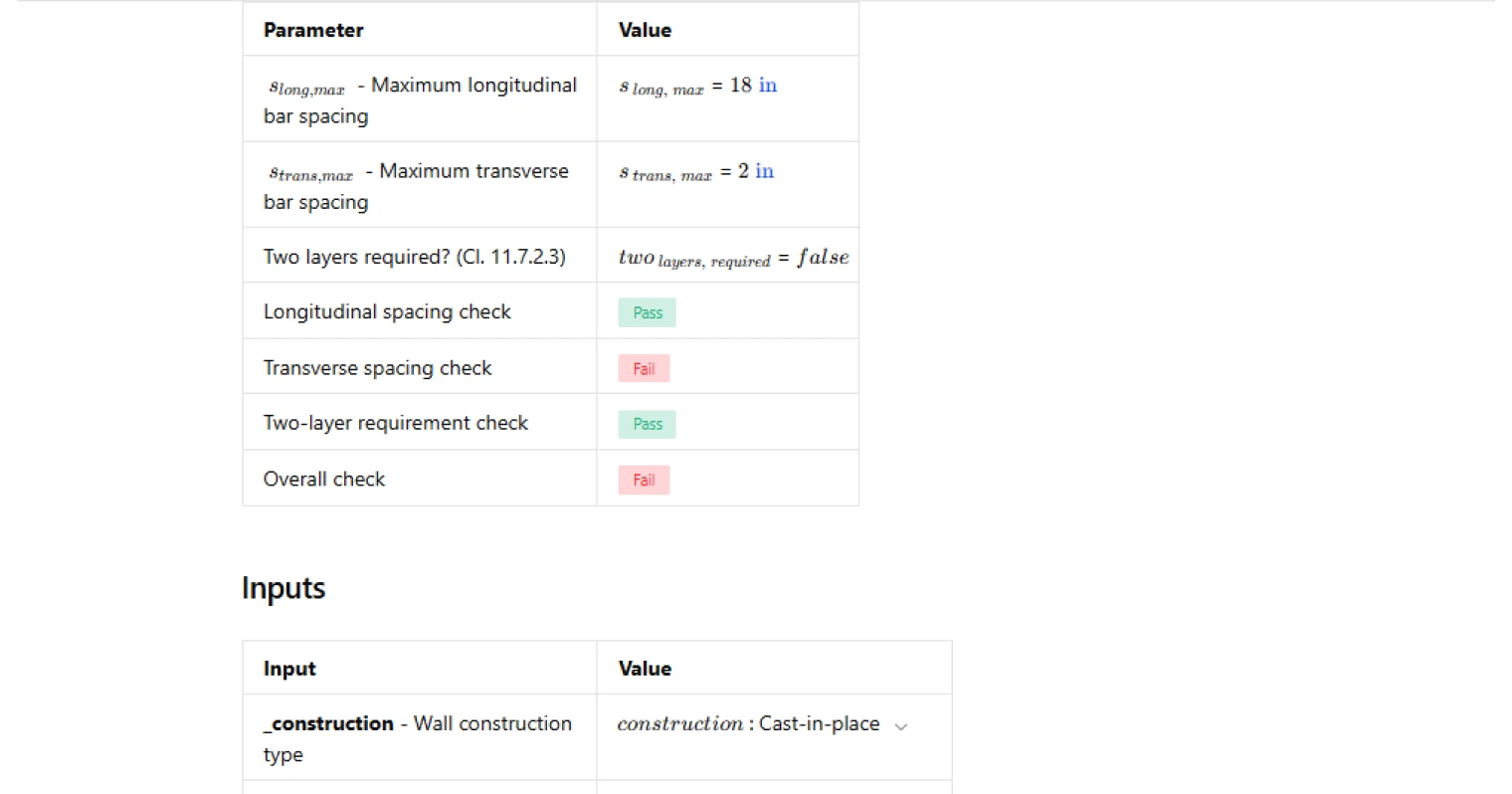 This calculator exposes the governing spacing limits, evaluates compliance of the provided reinforcement spacing, and checks whether two reinforcement layers are required based on wall thickness. It is an engineering-grade calculator on CalcTree that allows traceable verification of ACI wall reinforcement detailing rules.