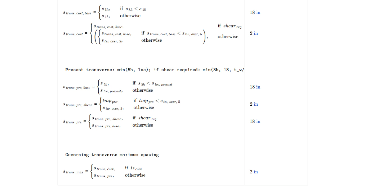 Maximum spacing for transverse reinforcement follows ACI 318 Clause 11.7.3. Similar to longitudinal reinforcement, the limits vary depending on wall construction type and whether shear reinforcement is required for in-plane strength. In some cases, additional spacing limits based on wall thickness apply. The calculator evaluates the candidate spacing limits and determines the controlling maximum transverse spacing.