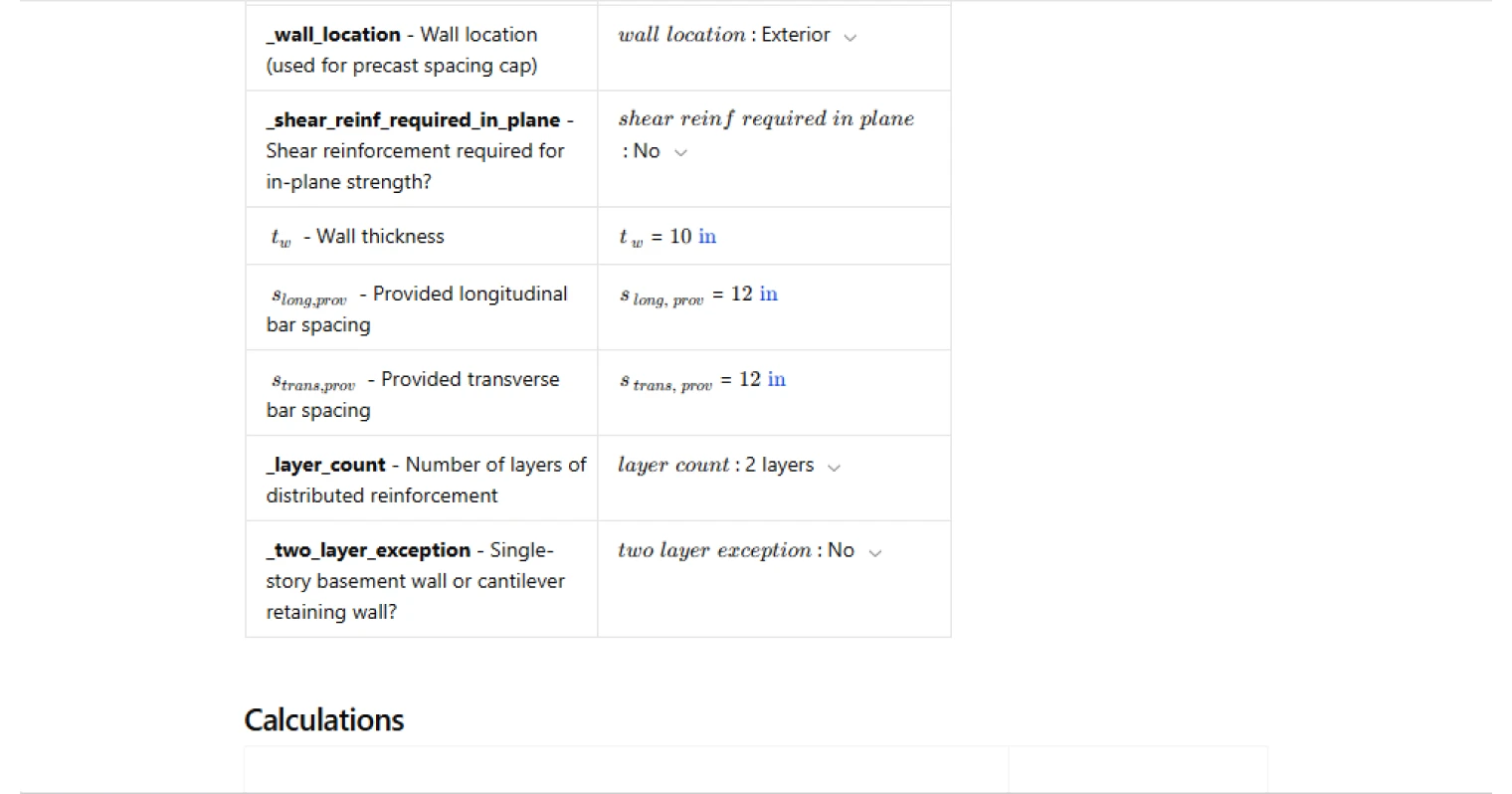 The calculator requires information describing the wall construction and reinforcement arrangement. These include the wall thickness, provided spacing of longitudinal and transverse reinforcement, and the number of distributed reinforcement layers. The user also specifies whether the wall is cast-in-place or precast, the wall location for precast construction, and whether in-plane shear reinforcement is required. These parameters determine the applicable spacing limits defined by ACI 318.