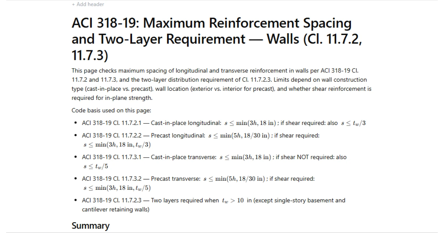 Check max wall reinforcement spacing per ACI 318-19 Cl. 11.7.2 & 11.7.3. Covers cast-in-place, precast & two-layer rules. Try the free CalcTree template.