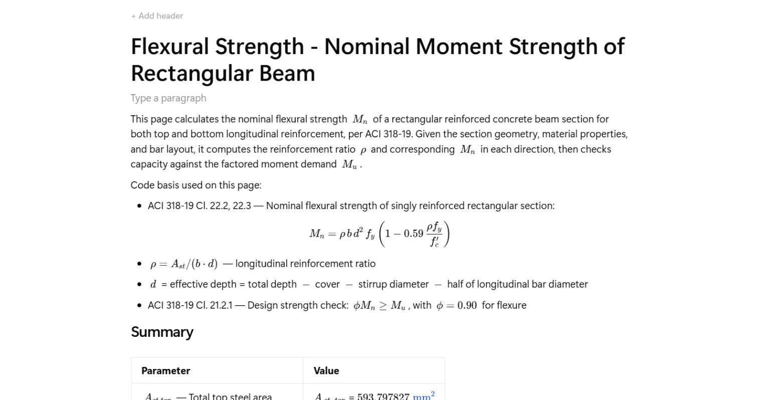 - Structural engineer — verify beam flexural capacity during design or peer review, with full traceability from bar layout through to the φMn ≥ Mu check.