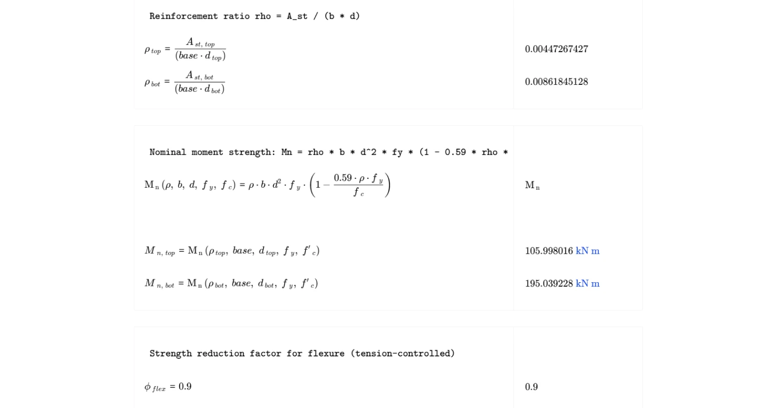 Nominal moment strength Mn is calculated for both the top and bottom steel using the ACI 318-19 rectangular stress block formulation per Cl. 22.2 and 22.3. The equation expresses Mn as a function of ρ, section width, effective depth, fy, and f'c, with the term in parentheses accounting for the reduction in internal moment arm as the compression zone deepens with increasing reinforcement ratio. This is evaluated independently for top and bottom steel using their respective effective depths and reinforcement ratios.