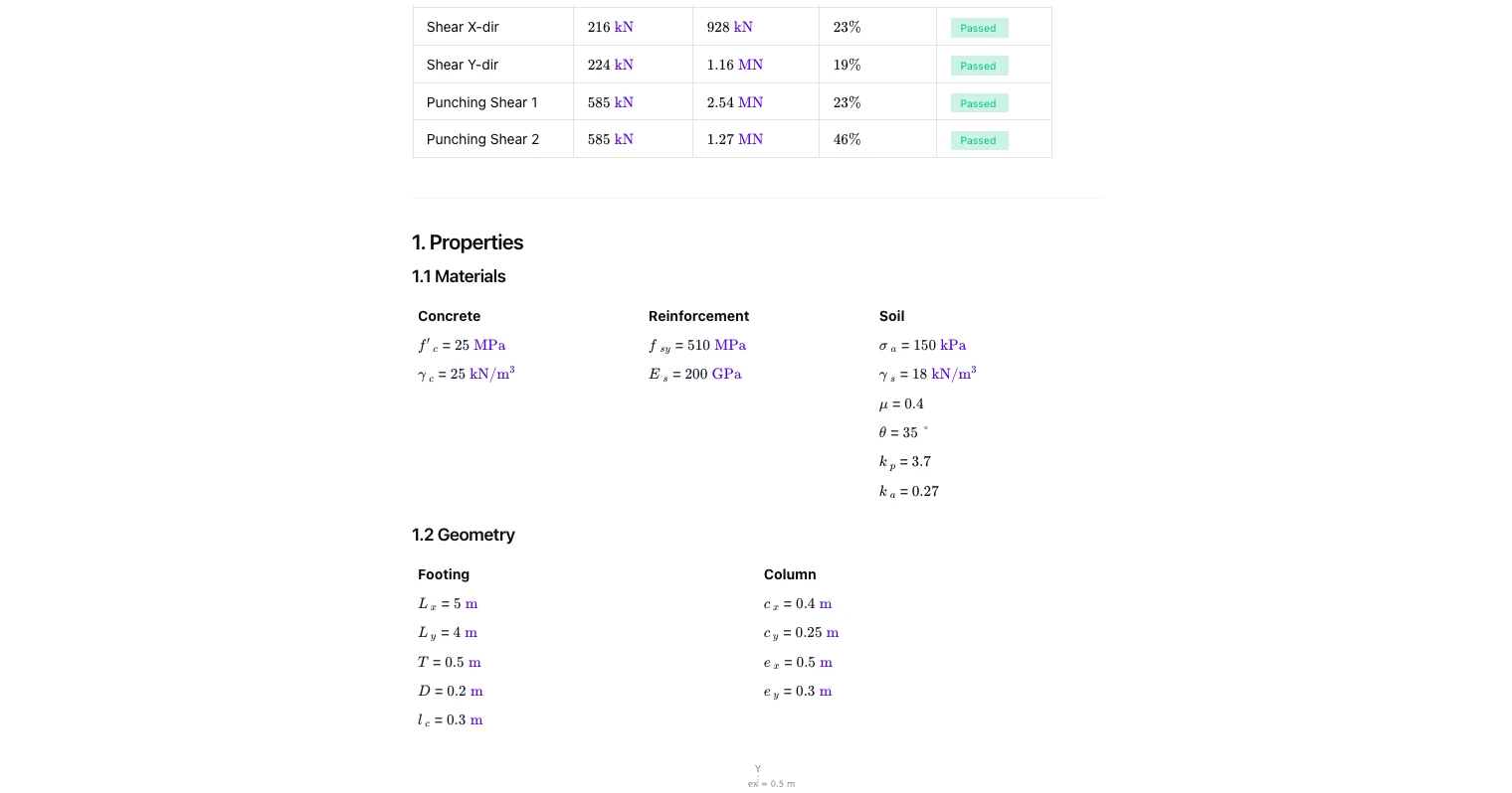 - Flexural capacity in X and Y with strength reduction factors and rectangular stress-block parameters
