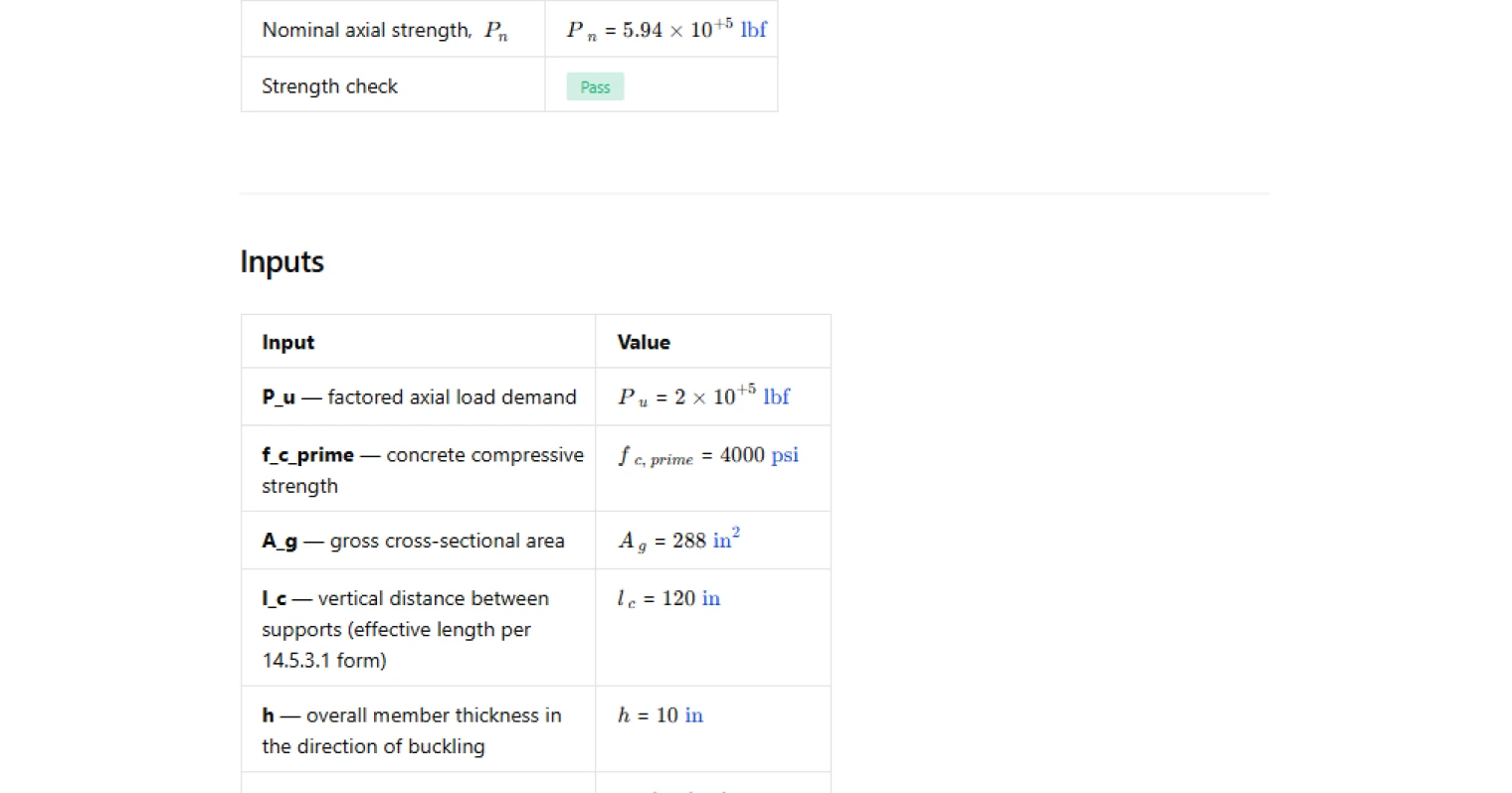 The calculation requires five geometric and material inputs. Concrete compressive strength and gross cross-sectional area define the baseline capacity of the section. The effective length of the member and its overall thickness in the direction of buckling together determine the slenderness term that reduces that baseline capacity. The factored axial load demand is entered to enable the demand-capacity check. Units must be kept consistent across geometry and force inputs to avoid scaling errors in the output.