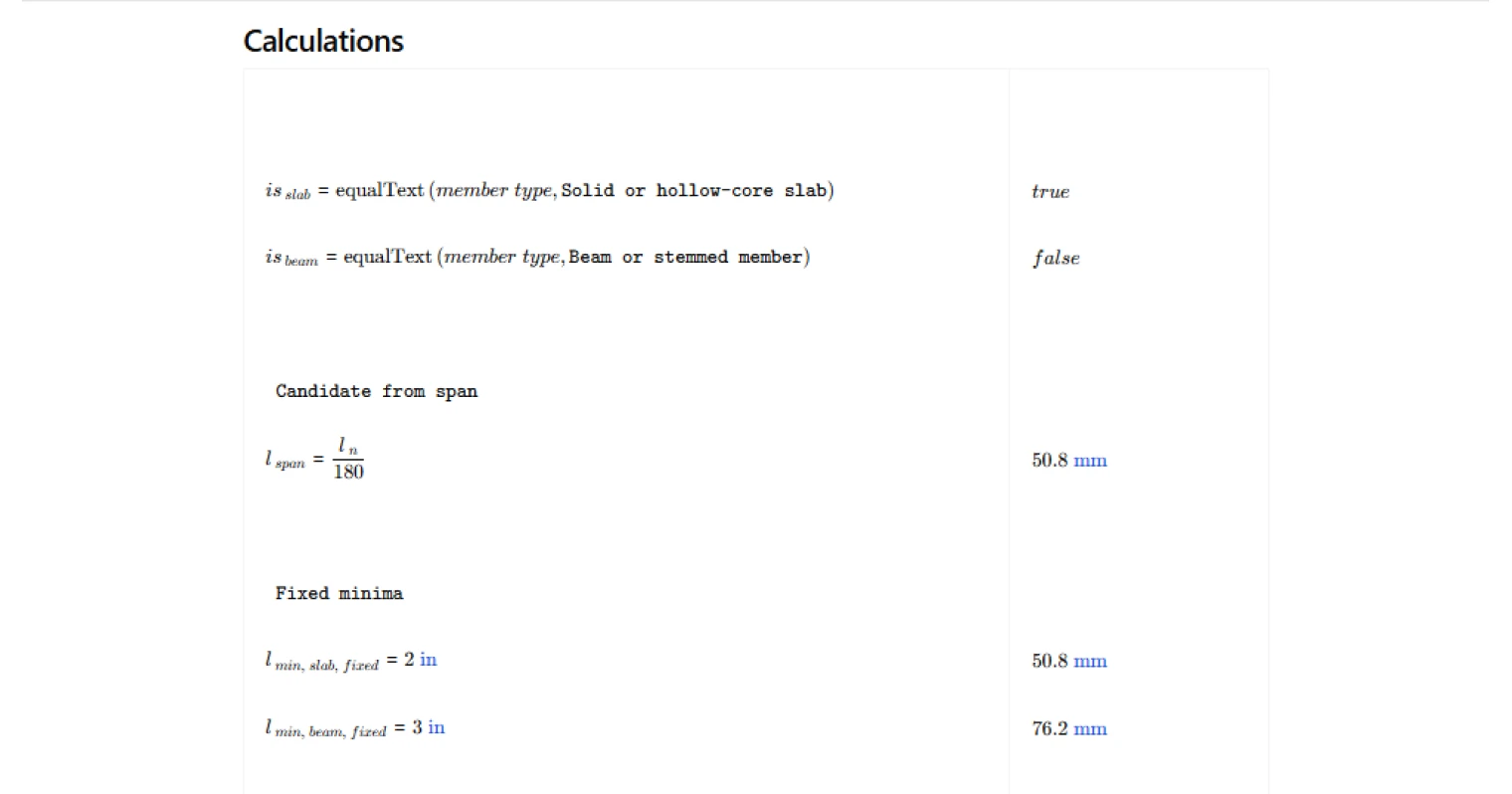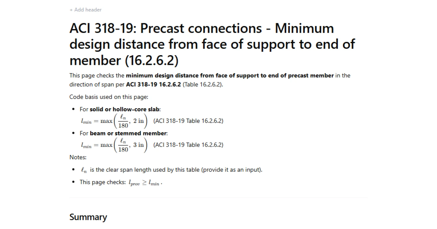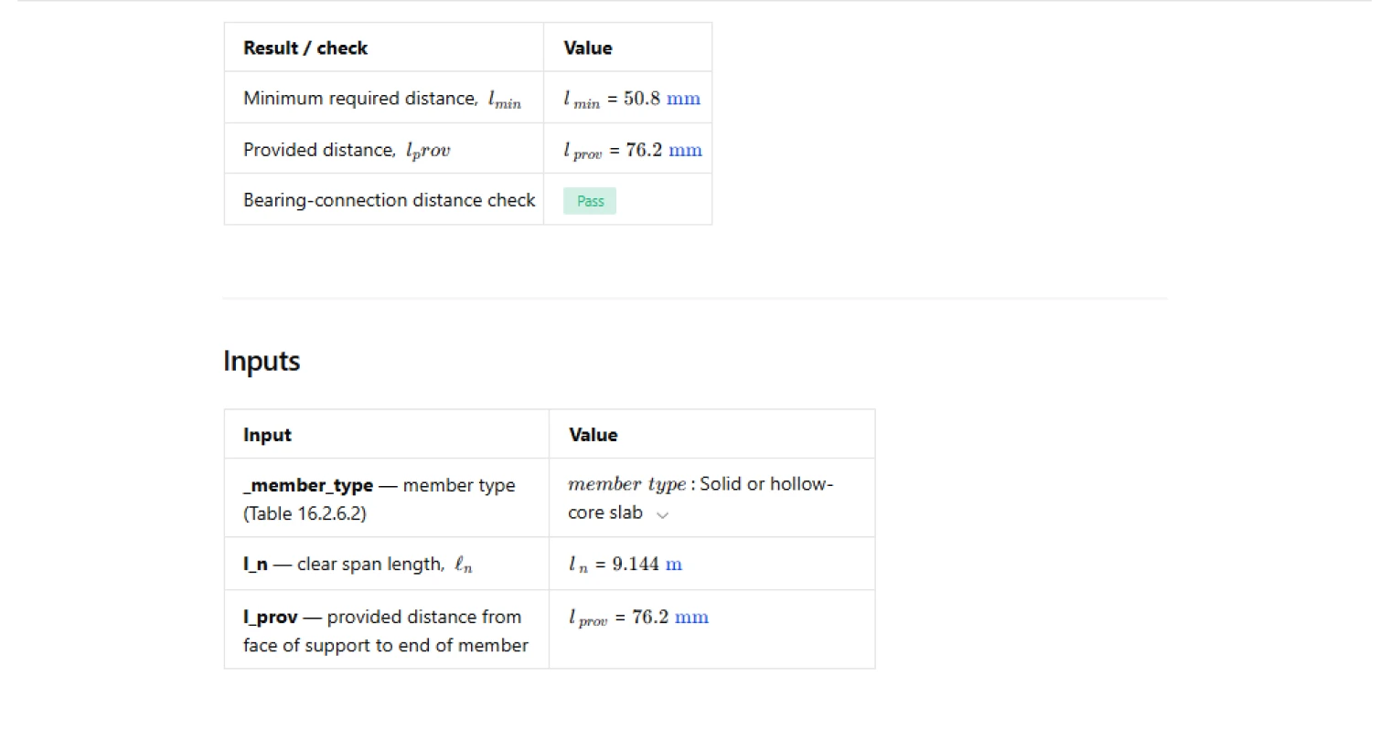 - Precast specialist — quickly confirm that bearing setbacks on corbels, ledger beams, or wall seats meet the code minimum for the member type and span length being detailed.