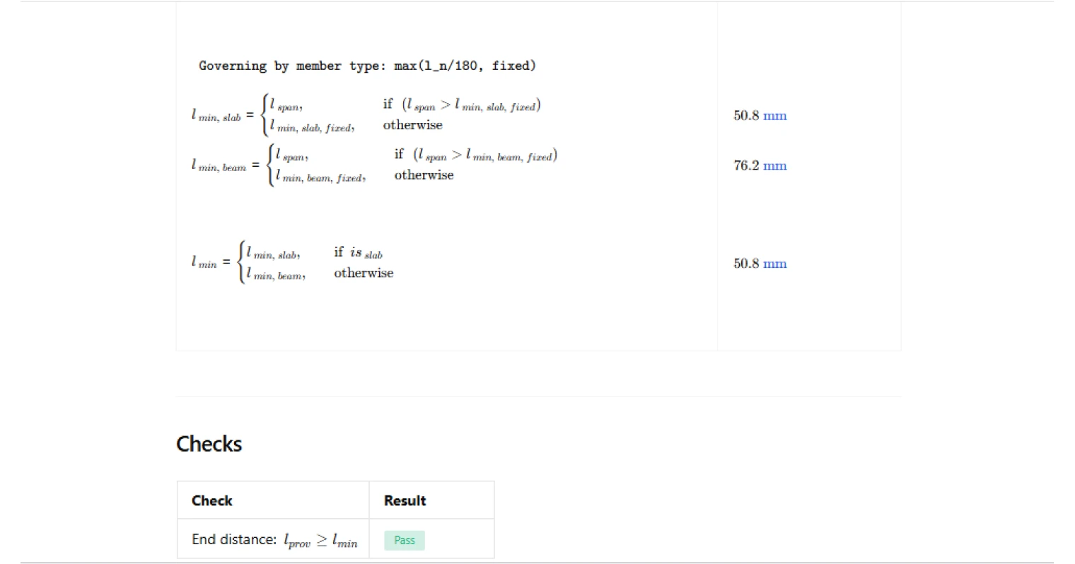 A failing result means l_prov is less than l_min. You have two practical paths: increase the physical end distance by extending the member further onto the support, or revisit the support geometry to move the face of the support closer to the member end. If the span is long and l_n/180 governs, check whether the clear span input is correct, as an error there is a common cause of unexpected failures.