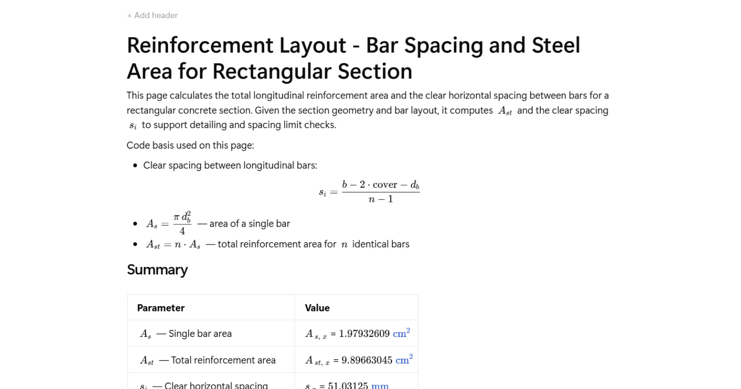 Calculate bar spacing and steel area for rectangular sections instantly. Reinforcement Layout tool checks Ast and clear spacing per ACI 318-19. Try it free.
