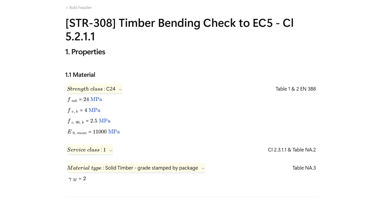 Timber Bending Check to EC5 - Cl 5.2.1.1: verify bending capacity fast with auto-calculated kmod, kh & notch factors. Try the free template on CalcTree.