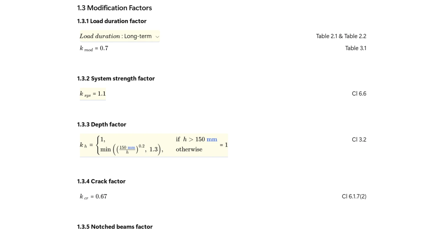 - Design checker / reviewer — audit the chain of factors (k_mod, k_def, γ_M, k_h, k_sys, k_cr, k_n, k_c,90) and confirm the calculation uses consistent assumptions and units.