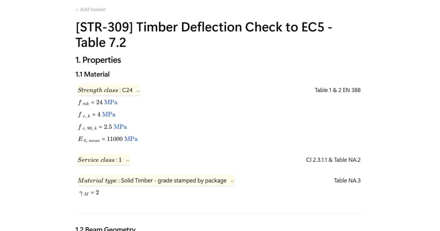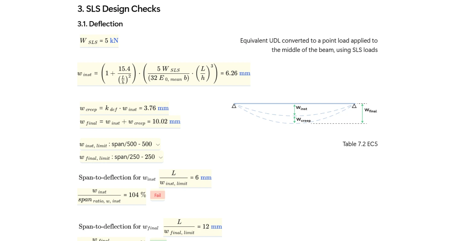 This template checks instantaneous deflection (w_inst) and final deflection (w_final) of a timber beam against span-to-deflection limits taken from Table 7.2 of EC5. Instantaneous deflection is calculated from elastic bending under SLS loads, including a shear deflection correction factor. Final deflection adds creep deformation using k_def. Both results are compared against user-selected span ratios such as span/300 or span/500.