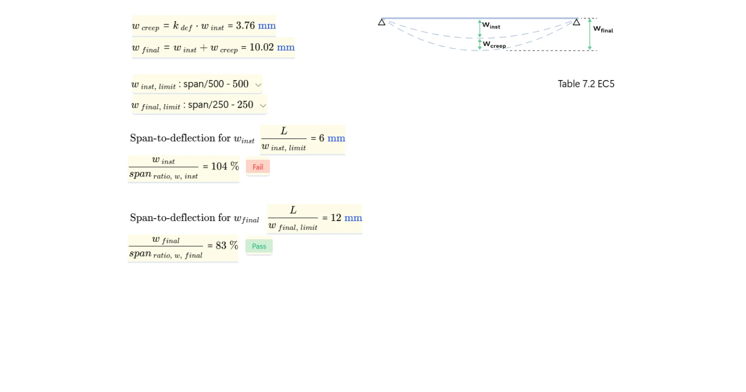 EC5 Table 7.2 gives recommended limits but notes these are indicative. National annexes or project specifications may override them. As a starting point, span/300 to span/500 for w_inst and span/150 to span/300 for w_final are common. Tighter limits are typically needed where finishes or partitions are sensitive to movement. The template lets you select from these options directly, so match the limit to your project specification.