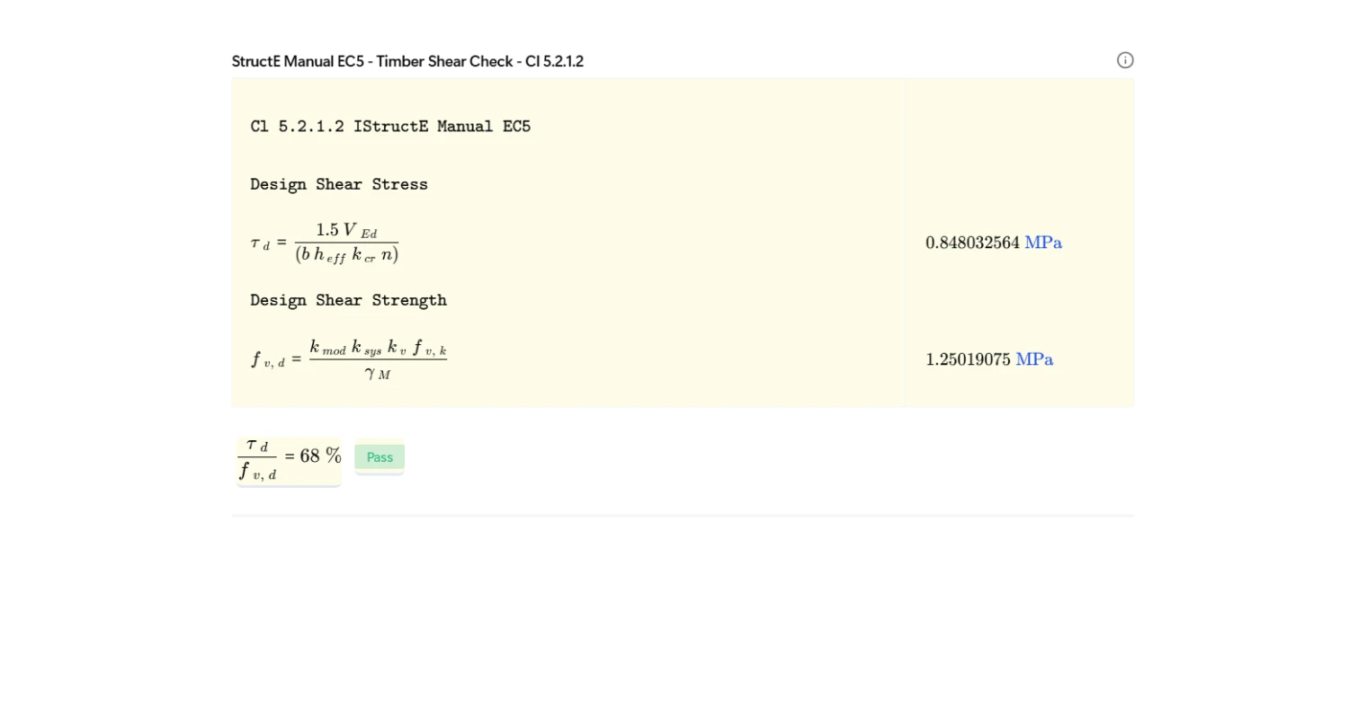 k_cr reduces the effective shear area to account for cracking along the grain in timber. For solid timber it is 0.67, and for most panel products it is 1.0. It is drawn automatically from the material type selection per EC5 clause 6.1.7(2). It directly reduces the denominator of the shear stress calculation, so using the wrong material type will produce an unconservative result.